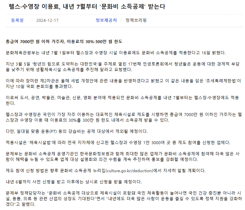 📍 체력 관리와 절세 혜택을 동시에 누릴 수 있어 직장인 및 건강에 관심 있는 국민들에게 실질적인 도움을 제공합니다.