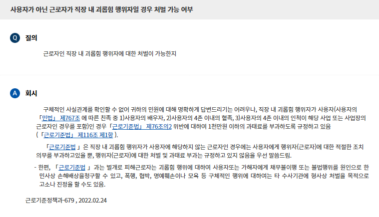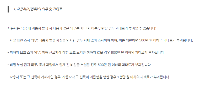 사용자나 그 친족이 괴롭힘을 행한 경우 1,000만 원 이하의 과태료가 부과됩니다.