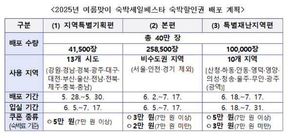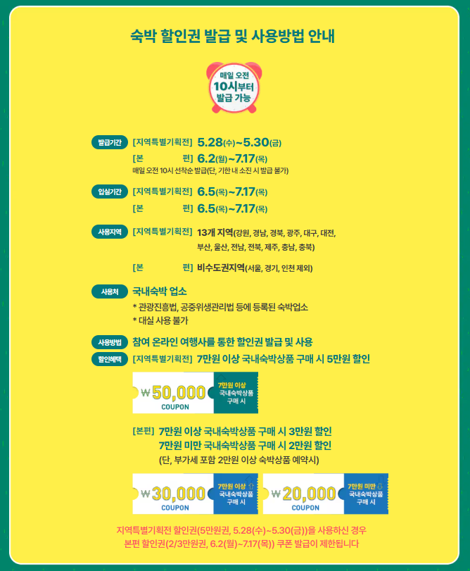 이번 행사는 국민의 여행 비용 부담을 줄이고 지역 경제를 활성화하기 위해 마련된 숙박 할인 캠페인으로, 3가지 유형의 할인권이 순차적으로 제공됩니다.