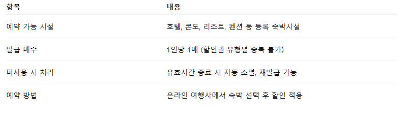 각 여행사에서 제공하는 숙박상품에 따라 할인권 사용 가능 여부가 달라질 수 있으니, 사전에 상세한 확인이 필요합니다.