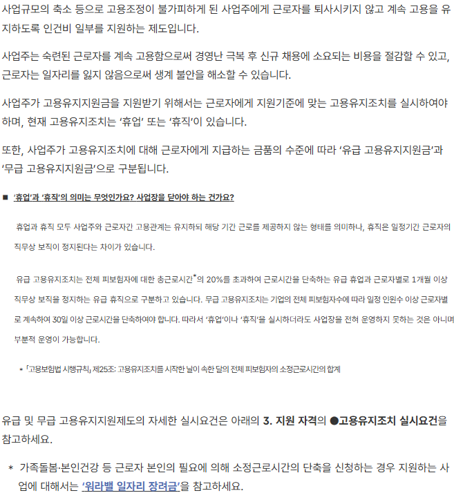 ☑️근로자를 해고하지 않고, 휴업 또는 휴직 등의 조치를 통해 고용을 유지하고 있음