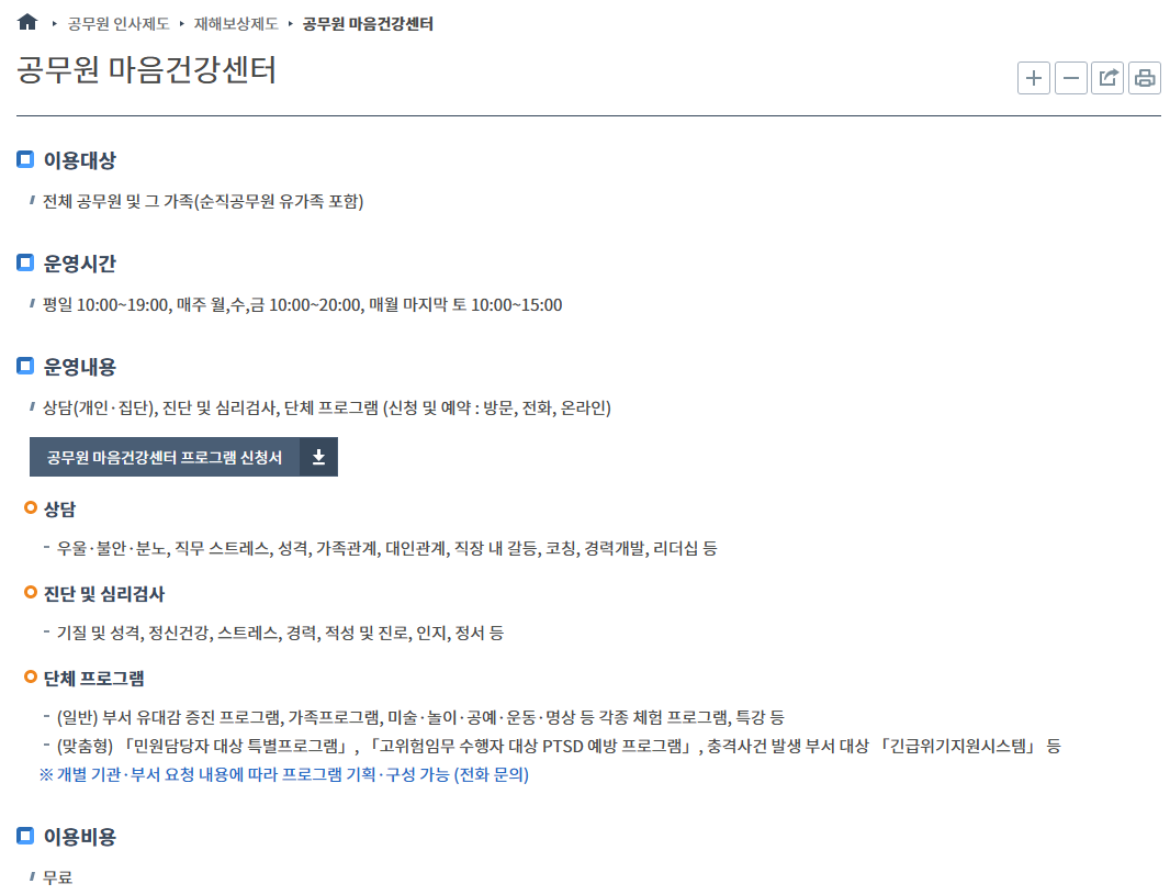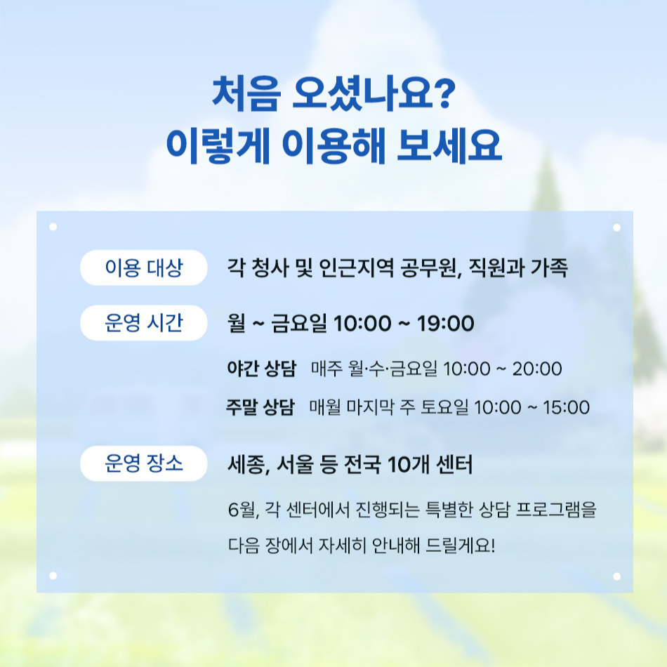 정기적인 심리 상담부터 심화 과정, 힐링 프로그램까지 다양한 서비스가 마련되어 있으며, 공무원 본인은 물론 가족과 소속 직원까지 무료로 이용이 가능합니다.
