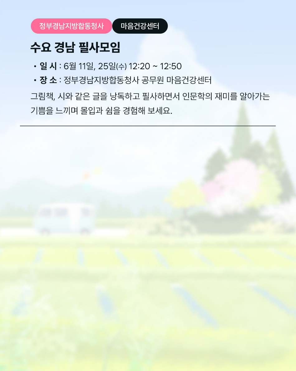 공무원 마음건강센터는 단순한 상담공간을 넘어 심리적 재충전과 자기 돌봄을 위한 플랫폼으로 진화하고 있습니다. 2025년 6월, 다양한 테마로 운영되는 전국 프로그램을 통해 바쁜 일상 속 자신에게 잠깐의 쉼을 선물해 보세요.