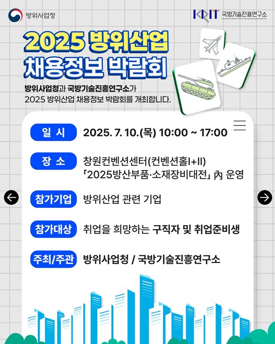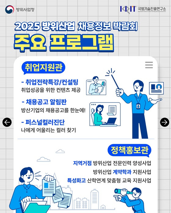 첨단 기술의 집약체인 방위산업 분야에 관심 있는 구직자들에게 있어, 진로 방향성을 찾을 수 있는 기회의 장이 될 것입니다.