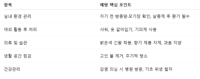 단지 모기를 피하는 것을 넘어, 모기의 서식지를 줄이고 물리지 않도록 행동수칙을 실천하는 것이 핵심입니다.