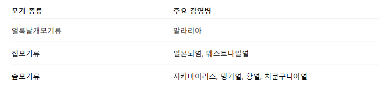 이들 감염병은 모기에 물린 후 바이러스나 기생충이 체내에 침투하면서 발생하며, 일부는 치명적인 증상이나 후유증을 남기기도 합니다.