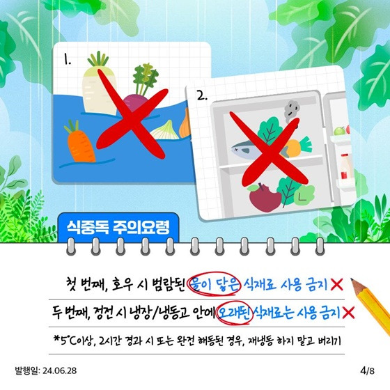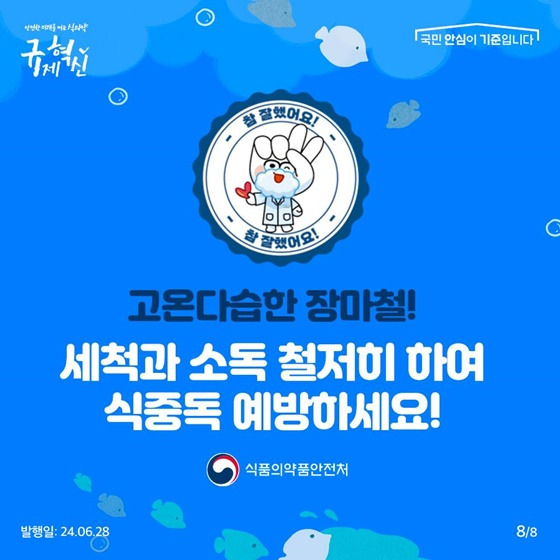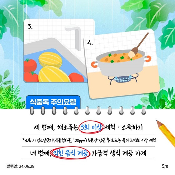 가정에서든, 단체 급식소에서든 장마철에는 ‘세척·소독·보관’이라는 세 가지 위생 원칙을 철저히 지키는 것이 가장 확실한 예방책입니다.