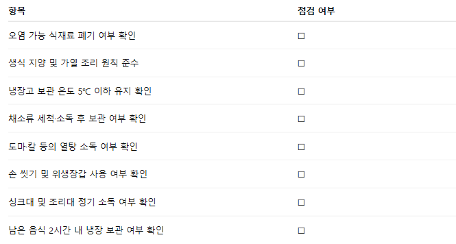 이 체크리스트를 활용하면 각 단계에서 위생 상태를 보다 체계적으로 점검하고, 식중독을 사전에 예방할 수 있습니다.