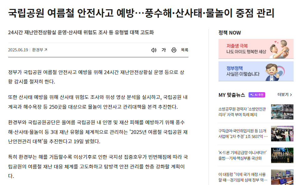 특히 풍수해, 산사태, 물놀이 사고는 여름철에 빈번히 발생하는 만큼, 정부의 대책과 더불어 개인의 경각심과 실천이 절대적으로 필요합니다.
