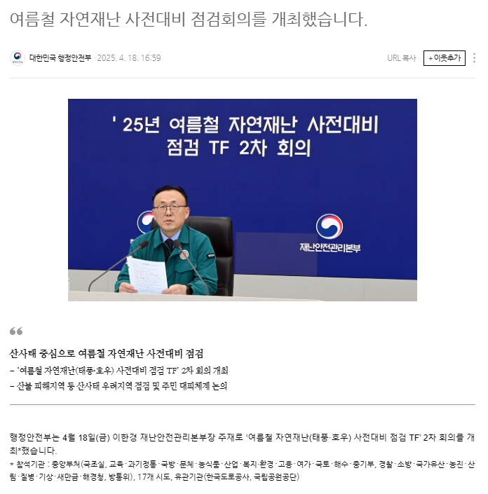 2025년 여름철 재난안전대책을 통해 국민의 생명과 안전을 지키는 데 정부와 민간이 함께 힘을 모으고 있습니다.
