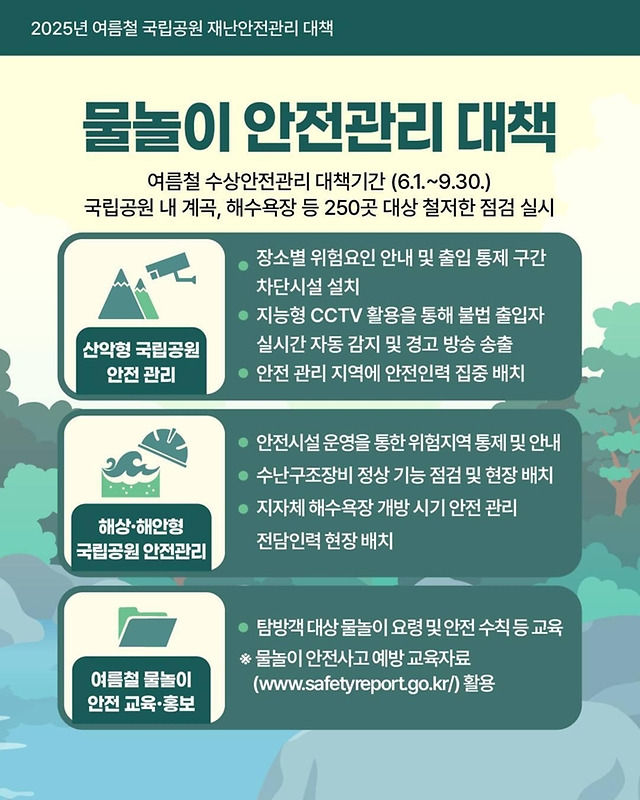 계곡, 해수욕장 등 주요 물놀이 장소에서는 탐방객을 대상으로 ‘물놀이 행동 수칙’, ‘익사 방지법’, ‘심폐소생술’ 등을 교육합니다.
