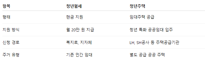 즉, 청년월세는 민간 임대주택 거주자에게 현금성 지원을 하는 제도이고, 청년주택은 정부가 별도로 건설하거나 확보한 임대주택에 입주하는 방식입니다.