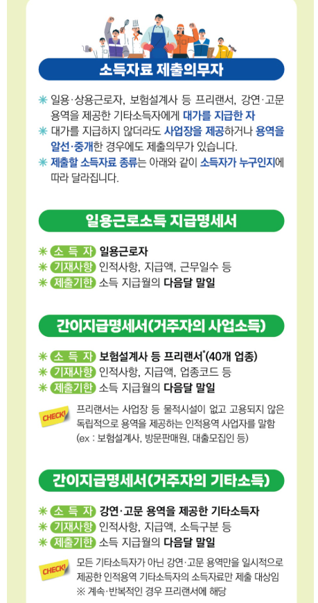 소득을 지급하는 입장에서는 매달 반복되는 자료 제출이 번거로울 수 있으나, 정확하고 성실한 제출을 통해 불이익을 방지하고, 세액공제 혜택까지 챙길 수 있는 제도라는 점에서 적극적인 이해와 참여가 필요합니다.
