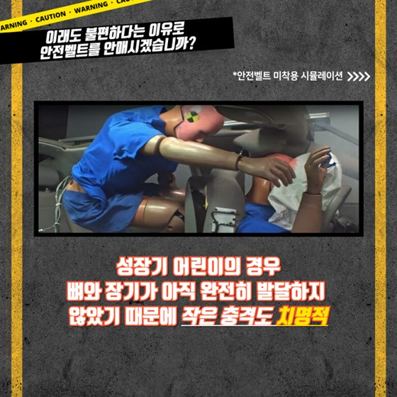 📍시속 30~60km의 충격에서도 안전벨트 미착용 시 치명적인 상해 가능