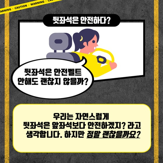즉, 뒷좌석은 안전한 공간이 아니며, 오히려 안전벨트를 하지 않을 경우 치명적인 결과를 초래할 수 있는 공간입니다.