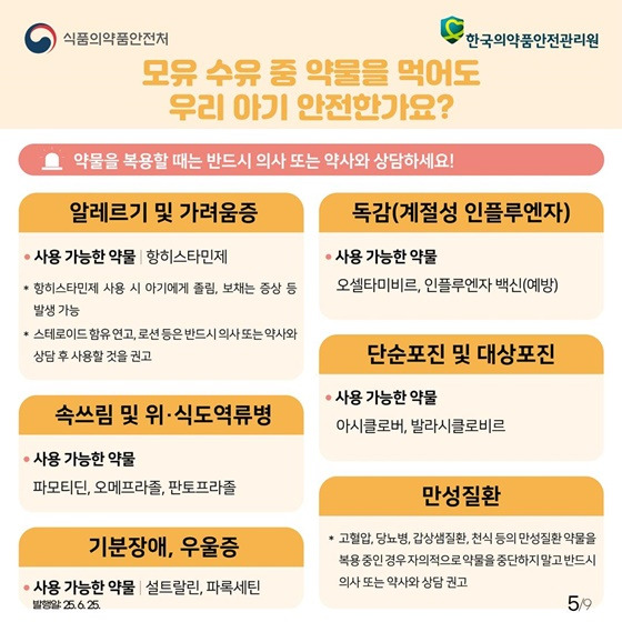 수유 중 복용해도 비교적 안전한 약물 vs 주의가 필요한 약물