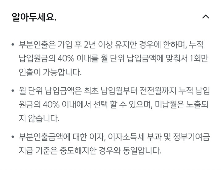 그러나 최근 특약 개정으로 인해 이제는 일정 요건을 충족하면 가입 기간 중 1회에 한해 자금 일부를 인출할 수 있는 길이 열렸습니다.