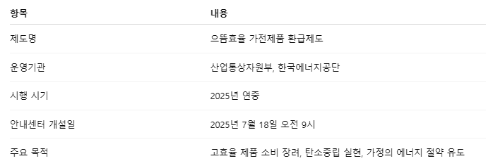이 센터는 소비자들이 보다 쉽게 고효율 가전제품 환급 제도를 이해하고, 온라인으로 편리하게 신청할 수 있도록 돕기 위해 마련된 전용 안내 플랫폼입니다.