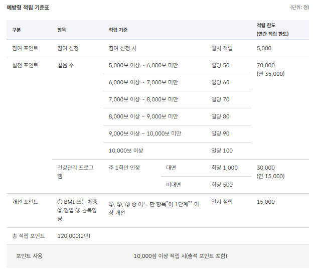 예방형은 주로 일상 속 실천(걷기 등)과 건강수치 개선 여부에 따라 보상이 주어집니다.