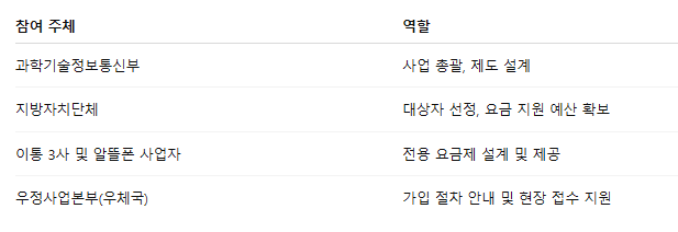 이번 알뜰폰 요금 지원제도는 단일 기관이 아닌 정부-지자체-민간사업자-우체국이 함께 역할을 분담하는 협업 모델입니다.