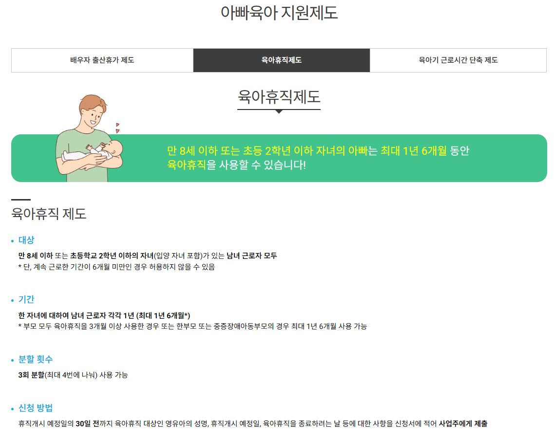 일반적으로 ‘아빠’가 두 번째로 육아휴직을 사용하는 경우가 많아 이와 같은 명칭으로 불리지만, 반드시 부가 아빠일 필요는 없습니다.