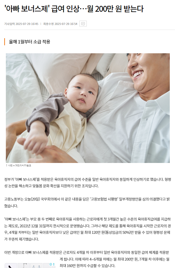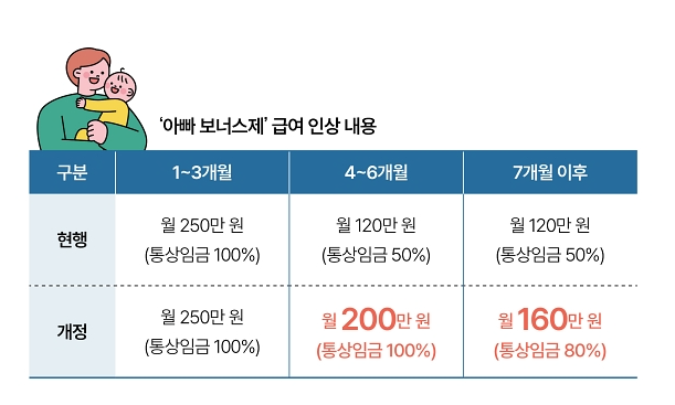 ✅아빠 보너스제 급여, 일반 육아휴직급여와 동일하게 인상
