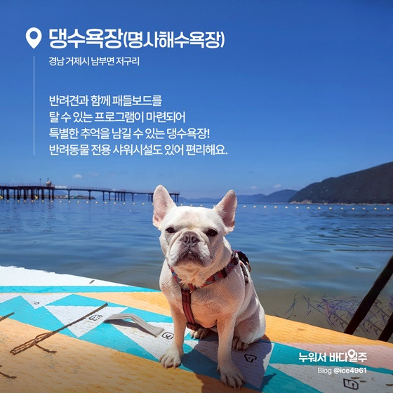 거제도의 남쪽 끝자락에 위치한 댕수욕장은 반려견 전용 해수욕장 중에서도 해양 레저 프로그램이 강점입니다.