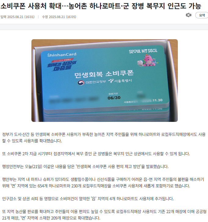 또한 기존 소비쿠폰 사용처가 없던 110개 면 지역의 121개 하나로마트는 이미 1차적으로 사용처로 확대되어, 주민 접근성이 한층 개선되었습니다.
