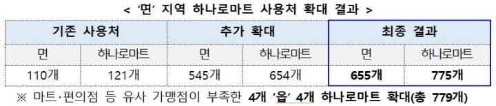 이에 따라 행정안전부는 22일부터 면 지역 654개 하나로마트를 사용처로 포함하고, 읍 지역 4개 하나로마트도 추가했습니다.