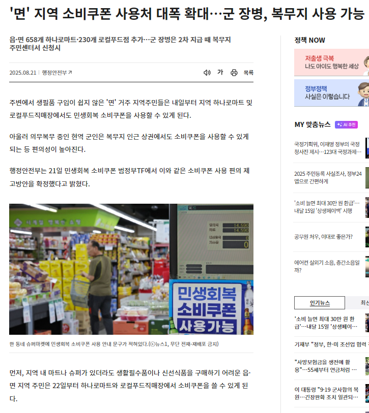 이번 민생회복 소비쿠폰 사용처 확대는 면 지역 주민과 군 장병의 생활 편의를 크게 높이고, 지역 경제 활성화에도 긍정적 영향을 미칠 것으로 보입니다.