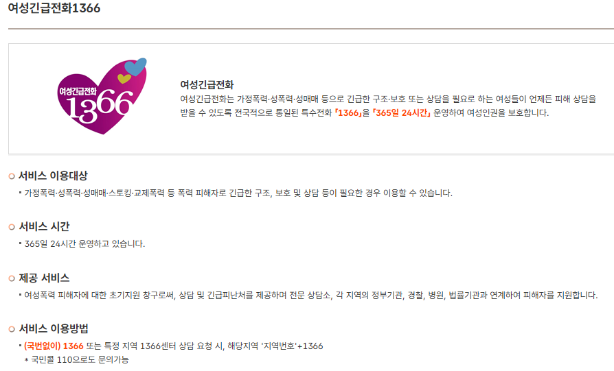 그러나 여성긴급전화 1366, 다누리콜센터 1577-1366, 전국 상담소와 보호시설을 통해 누구나 도움을 받을 수 있습니다.