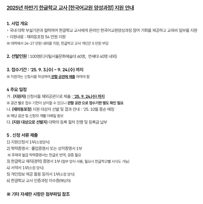 이번 글에서는 2025년 하반기 한국어교원 양성과정 지원 안내를 구체적으로 살펴보겠습니다.