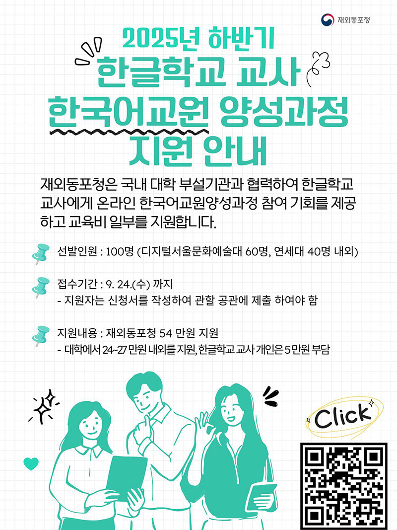 2025년 하반기에는 총 100명의 한글학교 교사가 선발됩니다.