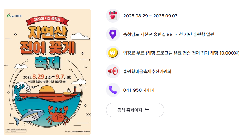 특히 이번 시즌에는 대하, 전어, 꽃게, 은갈치 등 다양한 제철 수산물을 현장에서 직접 시식하고 체험할 수 있어, 수산물 애호가뿐만 아니라 가족 여행객, 친구, 연인 모두에게 추천할 만한 축제입니다.