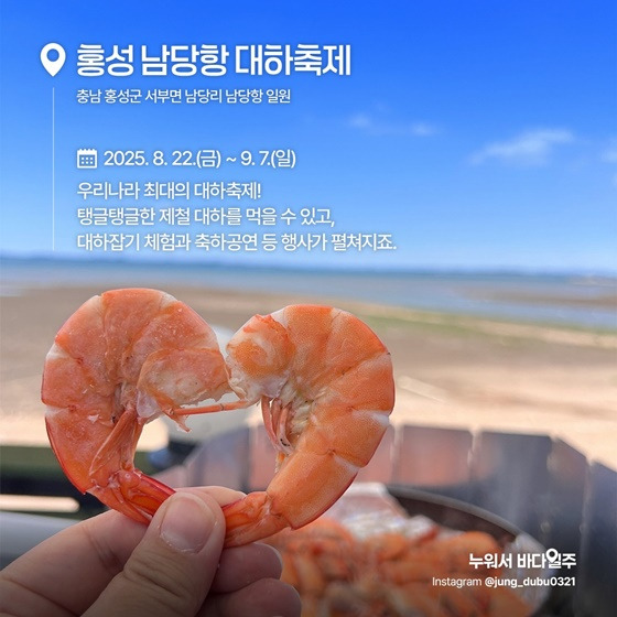 남당항 대하축제는 수확 철을 맞이한 탱글탱글한 대하를 직접 맛볼 수 있는 것은 물론, 다양한 체험 프로그램과 공연이 마련되어 있어 방문객에게 풍성한 즐길 거리를 제공합니다.