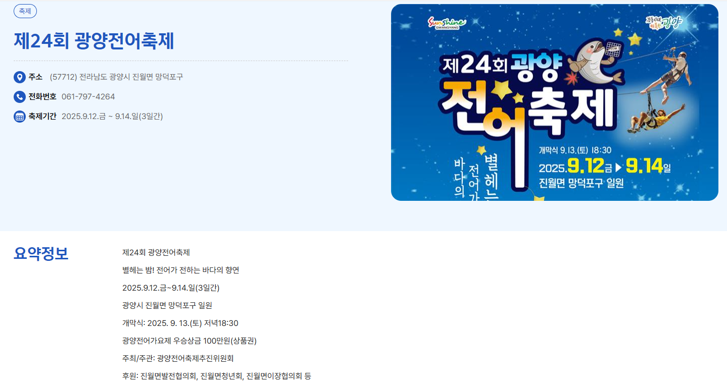 광양 전어축제는 전남 지역을 대표하는 전어 축제로, 풍성한 체험과 공연, 시식 프로그램으로 관광객을 맞이합니다.