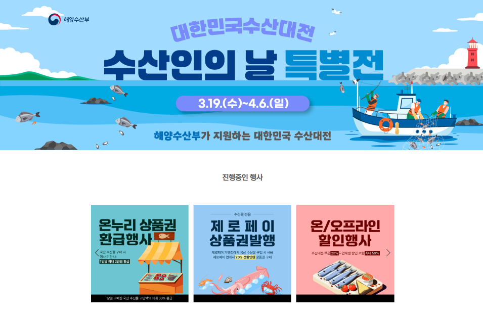 행사는 2025년 3월 19일(수)부터 4월 6일(일)까지 진행됩니다. 이 기간 동안 할인된 가격으로 다양한 수산물을 구매할 수 있으니, 꼭 놓치지 마세요!