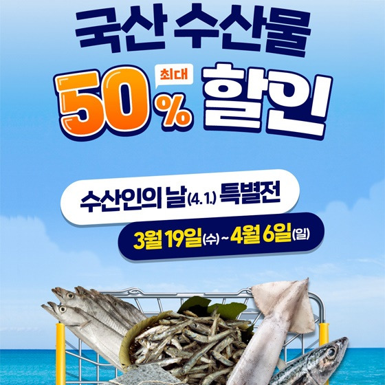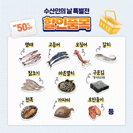 수산인의 날 특별전은 국산 수산물을 최대 50% 할인된 가격에 만나볼 수 있는 특별한 기회입니다.