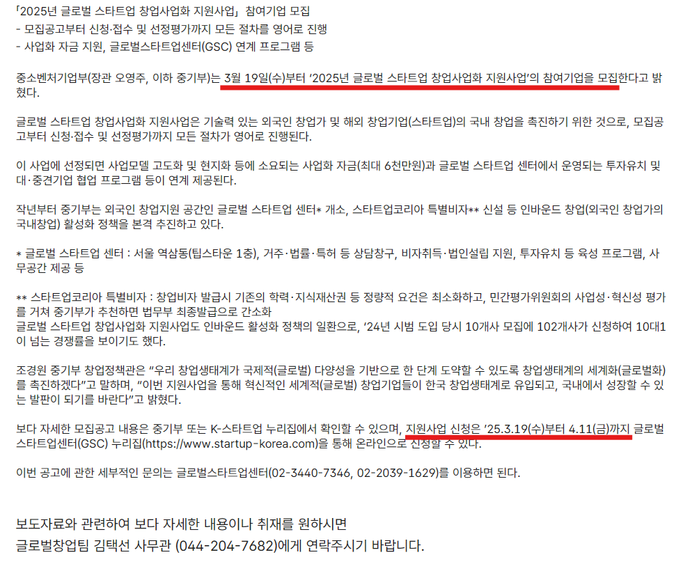 중소벤처기업부(중기부)는 3월 19일부터 2025년 글로벌 스타트업 창업사업화 지원사업 참여기업을 모집한다고 밝혔습니다.