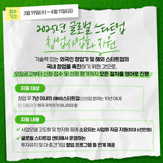이번 지원사업을 통해 글로벌 창업 기업들이 한국에서 활발히 성장하고, 한국 창업 생태계가 더욱 글로벌화되기를 기대합니다.
