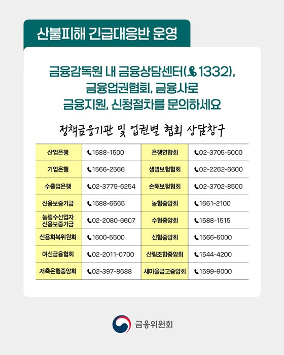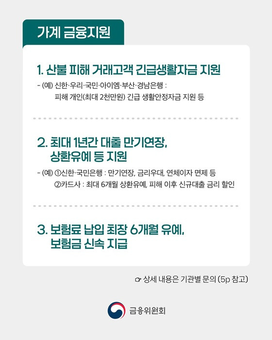 산불로 인한 피해를 고려하여, 주요 은행에서는 자금 지원 만기 연장과 상환 유예 등의 금융 지원을 제공합니다.