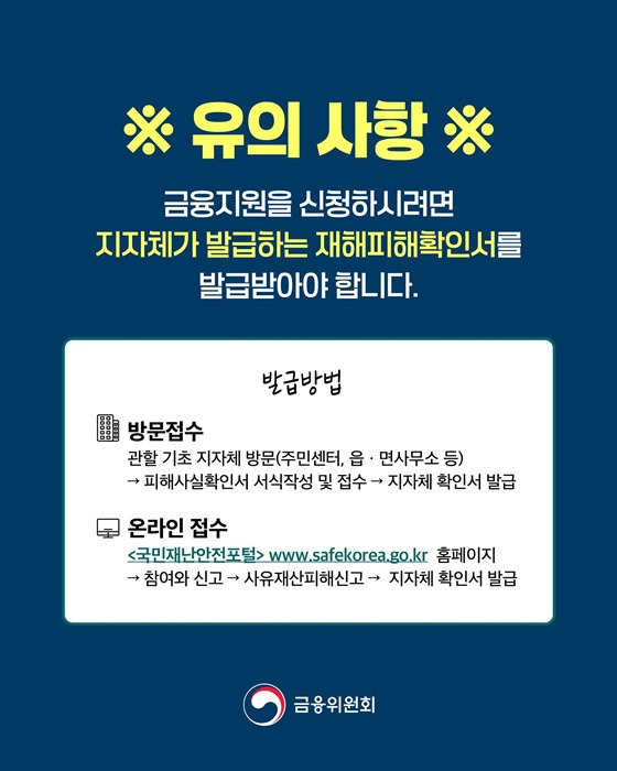금융지원을 신청하려면 피해 지역에 거주하는 개인 및 기업들은 지자체에서 발급하는 재해피해확인서를 발급받아야 합니다.