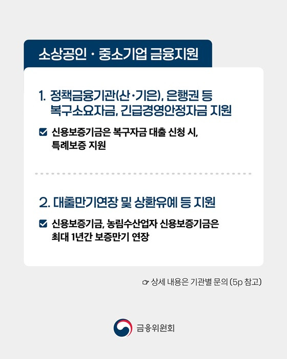 산림청 및 산업은행(산기은), 은행권 등에서는 피해를 입은 기업들이 사업을 회복할 수 있도록 자금을 지원하며, 신용보증기금은 이러한 자금을 자금 지원받을 때 특례보증을 지원합니다.