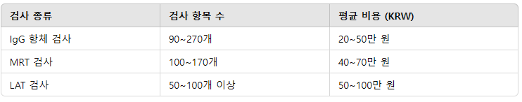 IgG 항체 검사, MRT 검사 등을 제공하는 경우가 많음