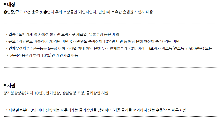 일시적 자금 경색 또는 경기 둔화로 인해 연체 가능성이 있는 소상공인의 부담을 완화하고 정상적인 상환 여건을 조성하기 위한 제도입니다.