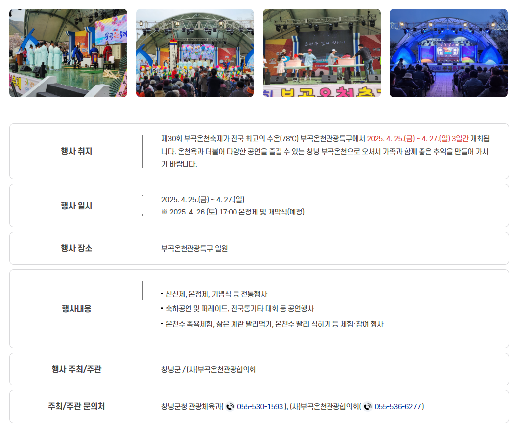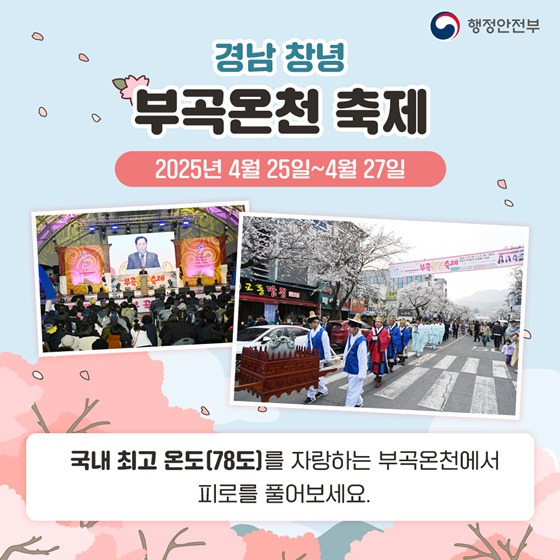 매년 봄 열리는 부곡온천 축제는 온천 체험뿐 아니라, 지역 농특산물 전시와 전통 체험, 체류형 관광코스까지 함께 즐길 수 있어 가족 단위 여행지로 추천됩니다.