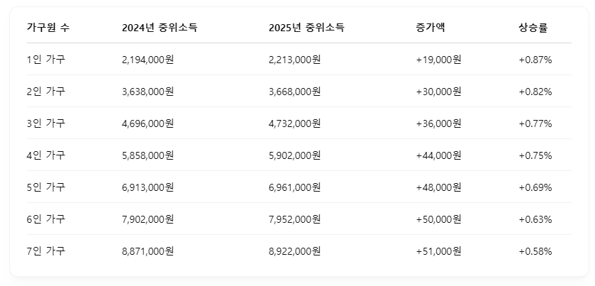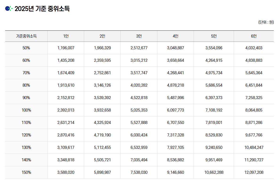 📌 2025년 기준 중위소득표 (월 소득 기준)