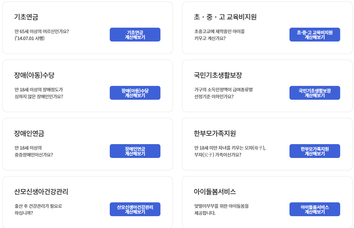 📌 ‘복지서비스 모의 계산’ 메뉴를 통해 가구 구성과 소득정보 입력 시 간편하게 확인 가능하며, 실제 신청은 주민센터 또는 온라인에서 가능합니다.