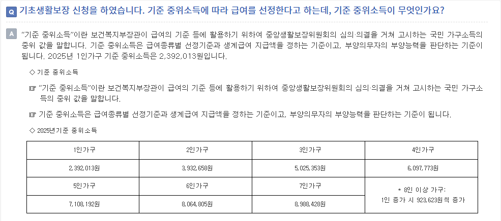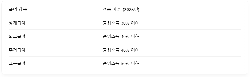 2025년 기준 중위소득은 여러 제도에 다음과 같은 방식으로 반영됩니다.