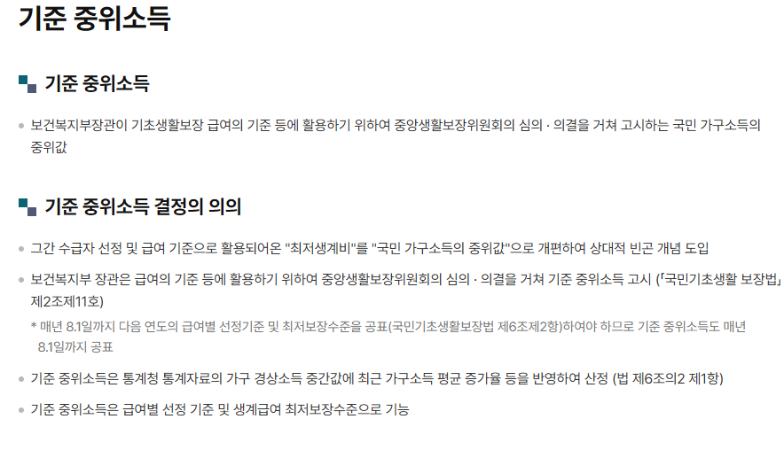 정부에서 시행하는 다양한 공공복지 및 사회보장 제도의 지원 자격 판단에 있어, 가장 널리 활용되는 기준이기 때문입니다.